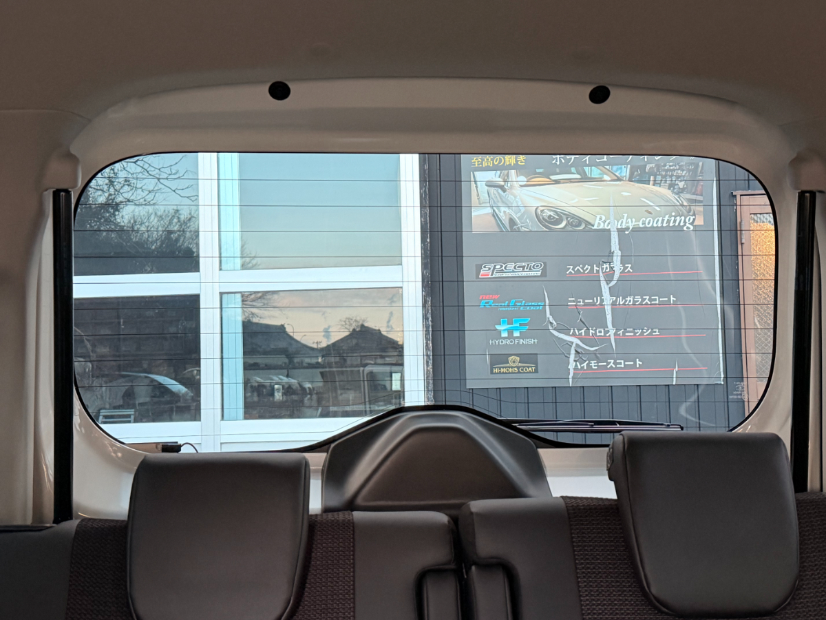 リアガラスは薄めの濃さである透過率23%のプレミアムカーフィルムを施工しました。薄い色のフィルムでなおかつフロントガラスが透明なので割と車内が見えています。
