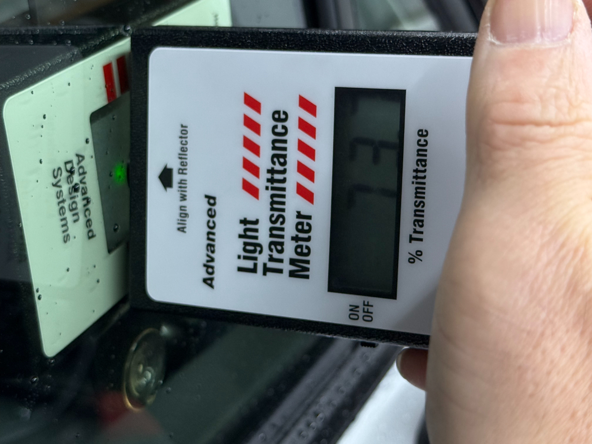 フロントガラス全面にも透明な遮熱カーフィルムを施工しました。透過率を測ったところ73.7%と高い数値が出ました。車検も行動走行も全く問題ありません。