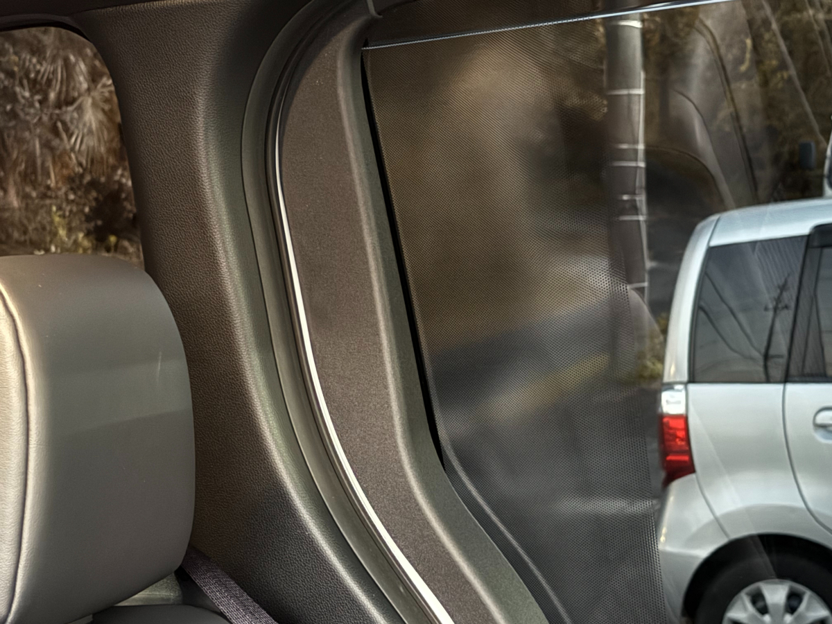 まずはカーフィルム施工です。スライドドアにドット対策カーフィルムの透過率5%を、リア3面に濃い目の濃さである透過率8%のフィルムを施工しました。かなり車内が見えづらくなっています。