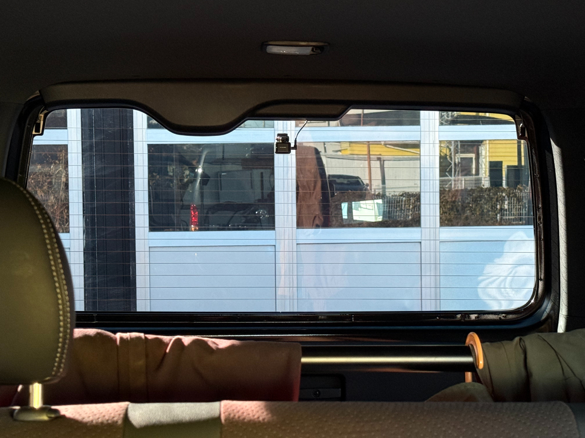 フロントガラスが透明なので真後ろからはヘッドレスト等がやや透けて見えています。夜間はほぼ車の中が見えなくなります。