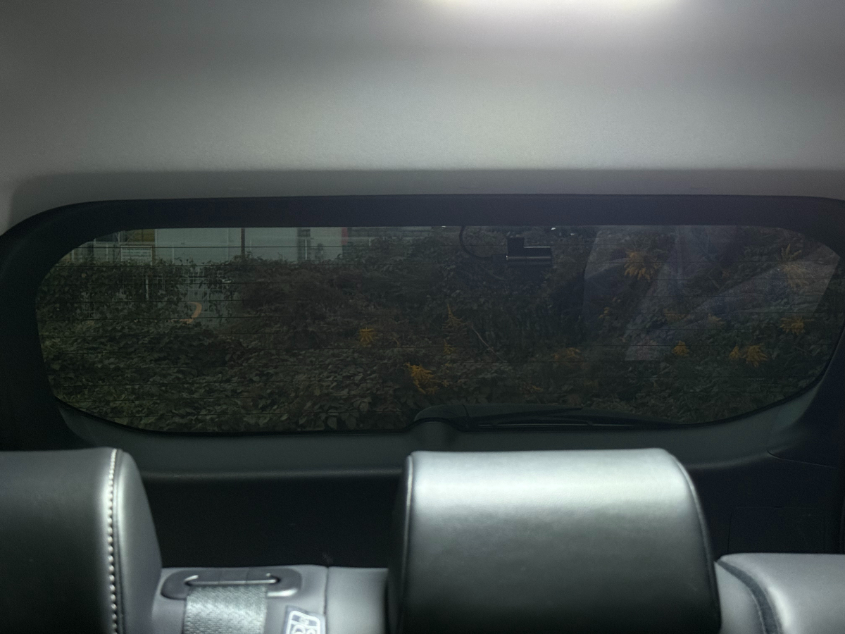 中からの視界はご覧の通りしっかり確保しております。辺りがかなり薄暗くなっていましたが目視で後方を確認できます。