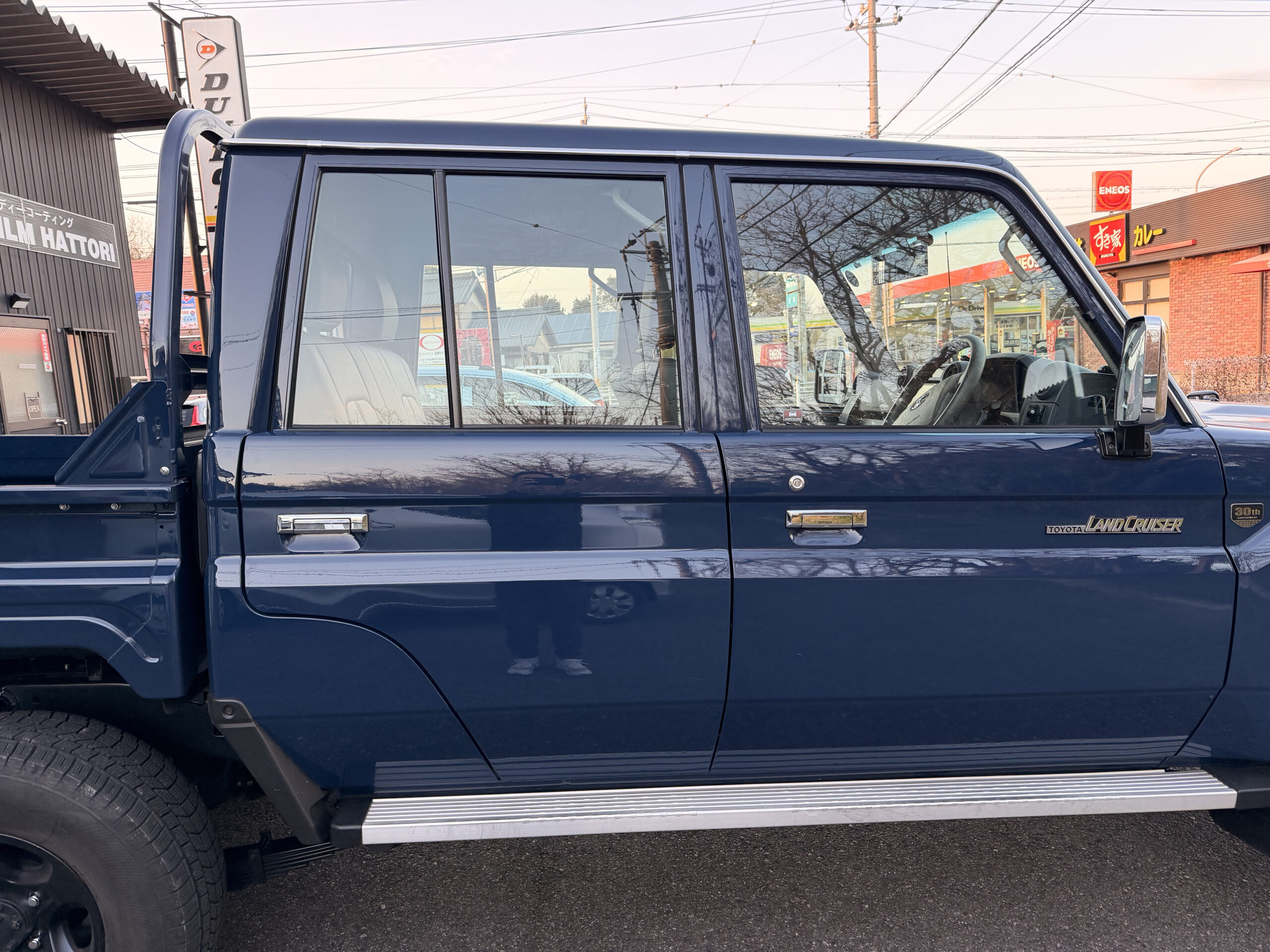 愛知県半田市からお越しのお客様のランドクルーザー70ピックアップに透明遮熱カーフィルムを施工しました。